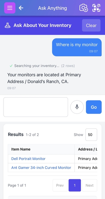 Scanlily's new Ask Anything feature lets you search your inventory list like a human. Ask 'where's the camera kit we used in San Diego last week?' and the AI understands what you mean, checks your inventory list, and tells you exactly where it is - down to its Aisle and Shelf.