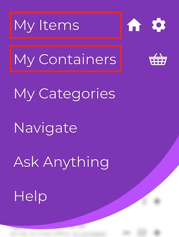 After logging in to your Scanlily account, click on the three-bar menu at the top left and click on My Items or My Containers: