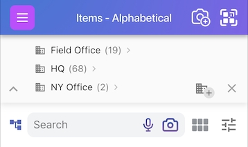 Clicking the Navigate button opens up your items list and gives you your first view of your navigation panel with your broadest locations, e.g. 'warehouse', 'headquarters' or say 'NY Office' displayed first: