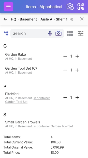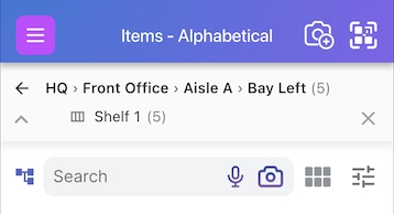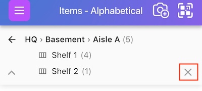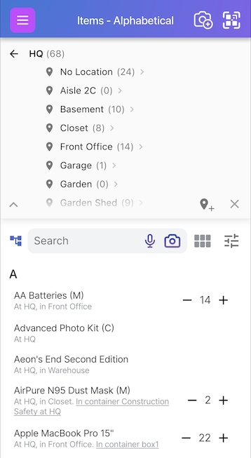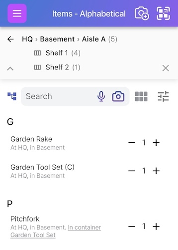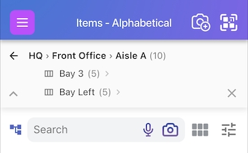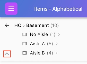 To go even deeper, tap on any of your sub locations - in this case, if we clicked on Basement nested under HQ, we can now see the aisles in the basement and the items list updates to only include items in the basement - 10 in total in this example: