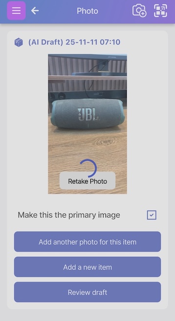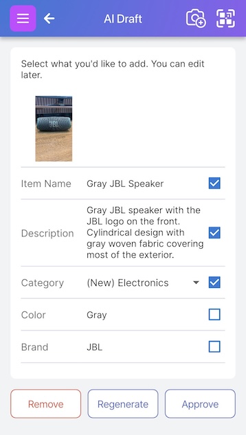 Scanlily’s incredibly powerful AI will automatically recognize what it is and also help you generate a quick but detailed description, give the item a name, and even categorize it into existing categories you’ve created.