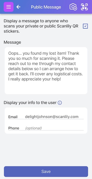 On the ‘Public Message’ page, check the ‘Display a message to anyone who scans your private or public Scanlily QR stickers’ box and review the public message.