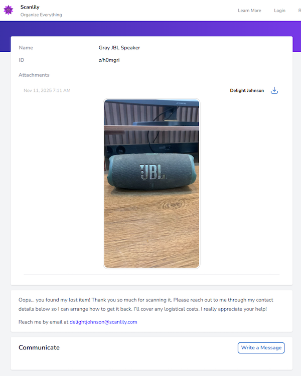 The ‘Public message’ you set in the previous step is displayed to the finder, as well as the description that Scanlily’s AI generated for you (or the one you’ve tweaked):