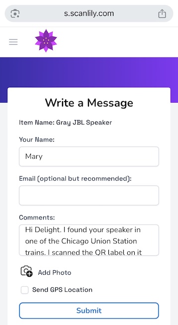 The finder can then reach out to you via the contact information you provide or get back to you via the Scanlily messaging portal without needing to download the app or even sign up.