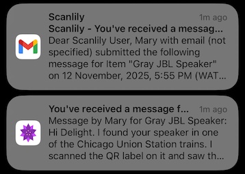 In your Scanlily app, you’ll receive the message the finder sent to you but we’ll also send an email telling you you’ve received a new message!