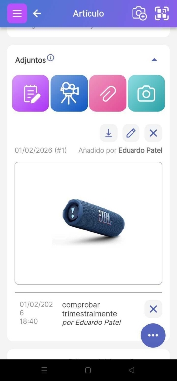 Los suscriptores multiusuario pueden tener diferentes usuarios que adjunten diferentes notas, imágenes y videos sobre el artículo como una conversación continua con marca de tiempo. Sus nombres aparecerán entonces en este hilo, como se muestra arriba.
