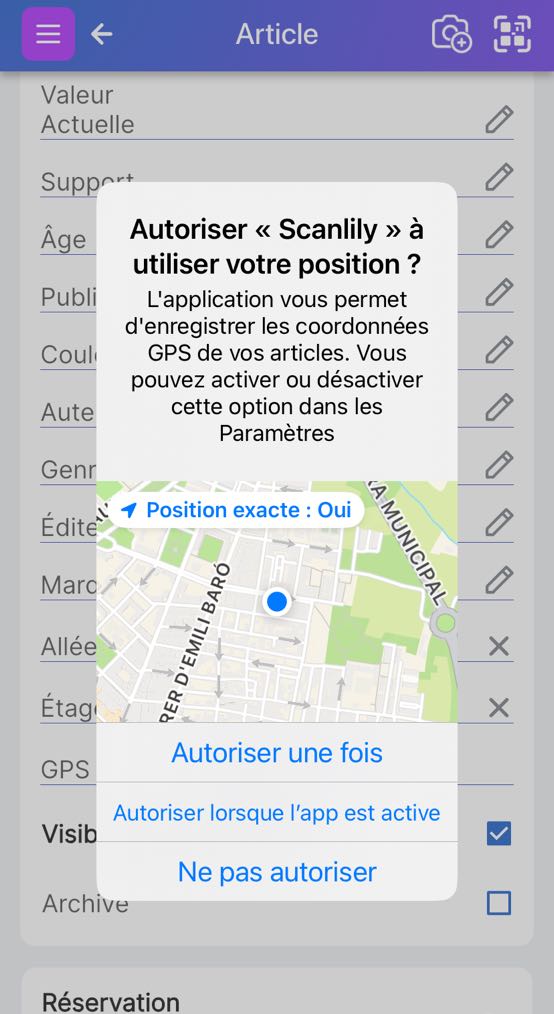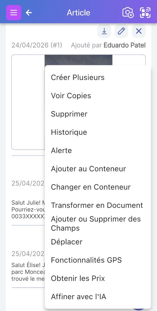 Sur la page des articles, cliquez sur l’icône QR à côté de l’icône ‘camera+’ pour scanner l’étiquette QR que vous souhaitez joindre à votre article.