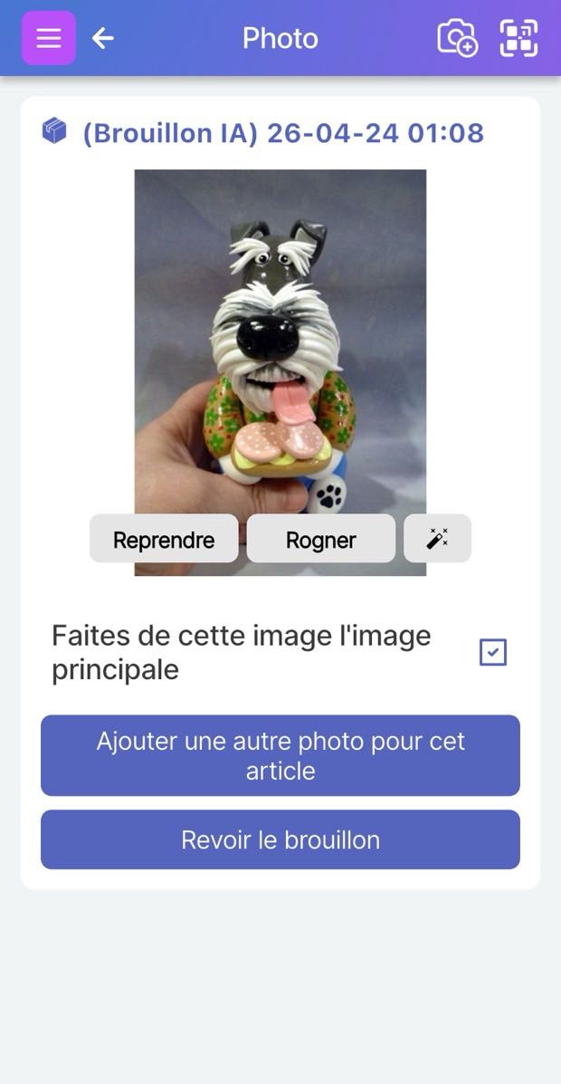 Prenez une photo rapide et complète de votre article. Vous pouvez utiliser la fonction de recadrage pour vous concentrer sur l’image de l’article et supprimer tout bruit de fond. Cliquez sur ‘Terminé’. Cliquez sur ‘Vérifier le brouillon’.