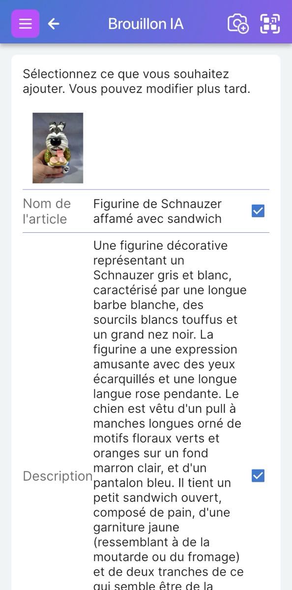 L’IA incroyablement puissante de Scanlily reconnaîtra automatiquement de quoi il s’agit et vous aidera également à générer une description rapide mais détaillée, à donner un nom à l’article et même à le classer dans les catégories existantes que vous avez créées.