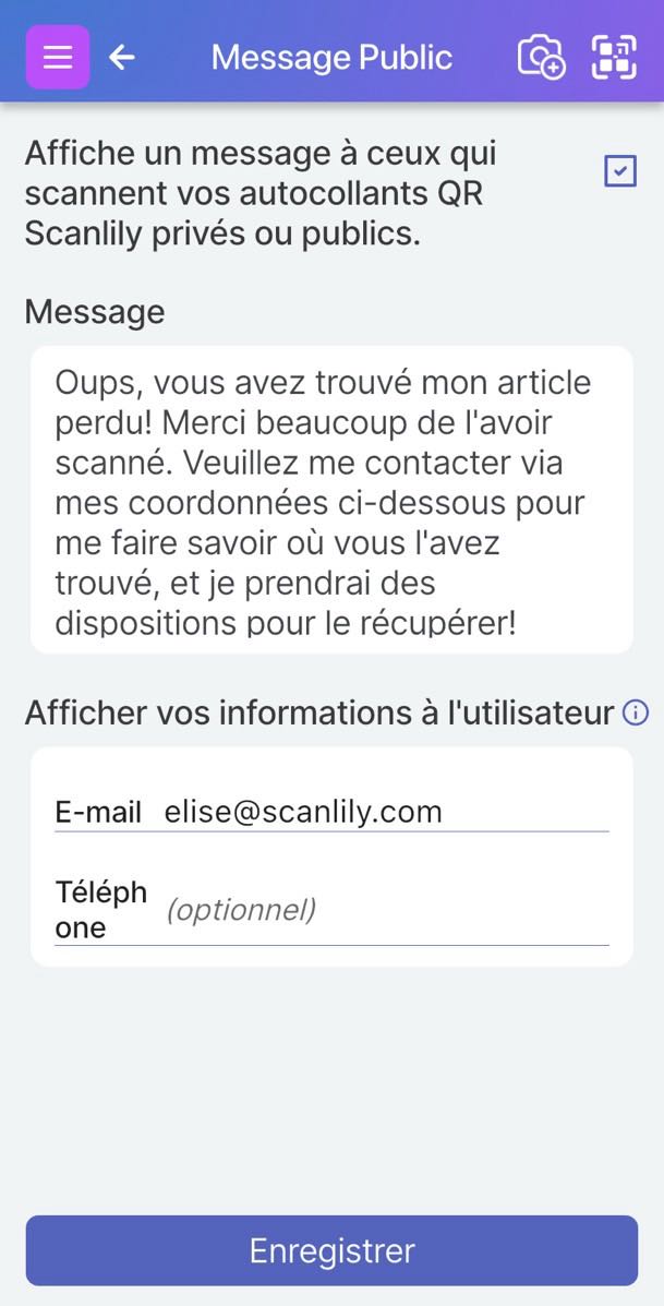 Sur la page « Message public », cochez la case « Afficher un message à toute personne qui scanne vos autocollants QR Scanlily privés ou publics » et vérifiez le message public.