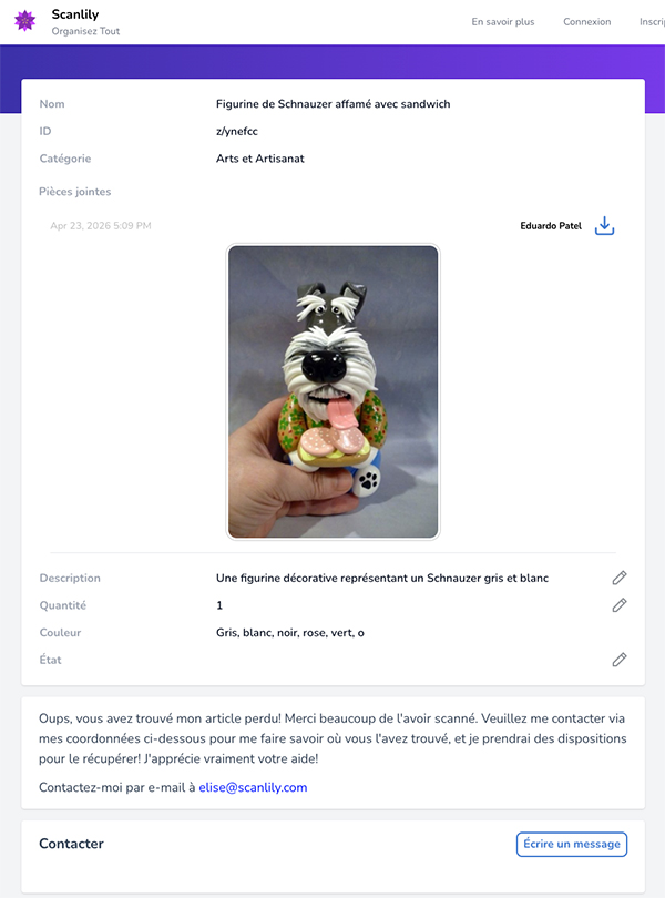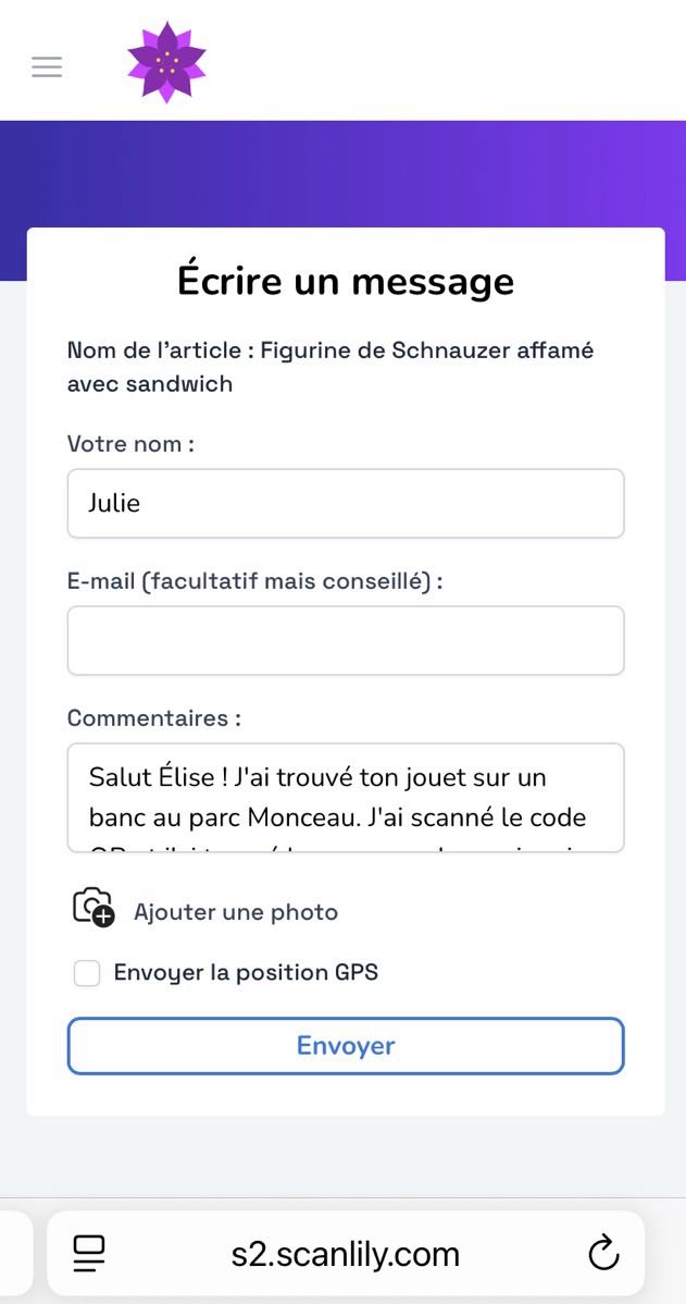 La personne qui l'a trouvé peut alors vous contacter via les informations de contact que vous fournissez ou vous recontacter via le portail de messagerie Scanlily sans avoir besoin de télécharger l'application ni même de s'inscrire.