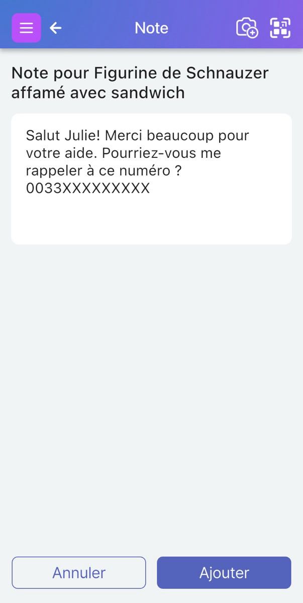 « Oups, vous avez trouvé mon article perdu ! Merci beaucoup de l'avoir scanné. Veuillez me contacter via mes coordonnées ci-dessous pour me faire savoir où vous l'avez trouvé, et je prendrai des dispositions pour le récupérer ! J'apprécie vraiment votre aide ! »