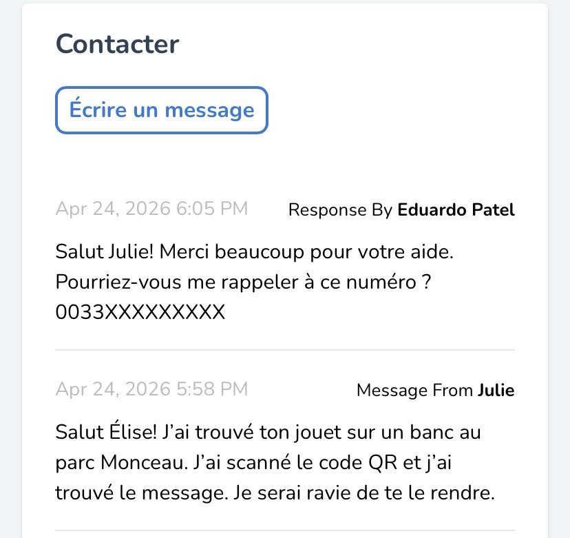 La fonction Objets trouvés de Scanlily permet aux personnes qui scannent un QR sur votre article perdu de vous contacter en toute confidentialité et de coordonner le retour de l'article.